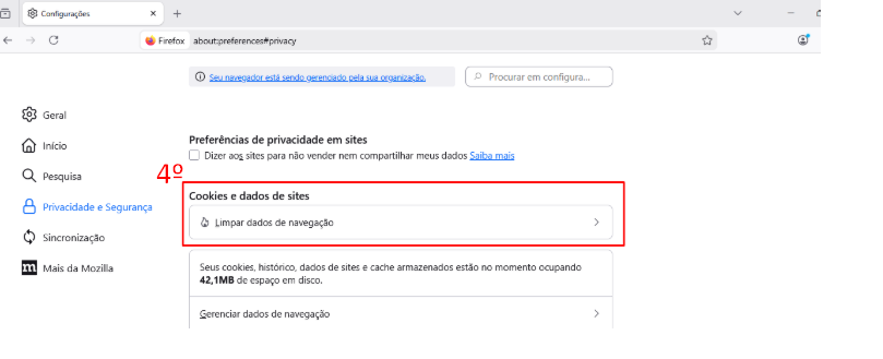 - Na seção "Cookies e dados de sites", clique em "Limpar dados de Navegação" (4)